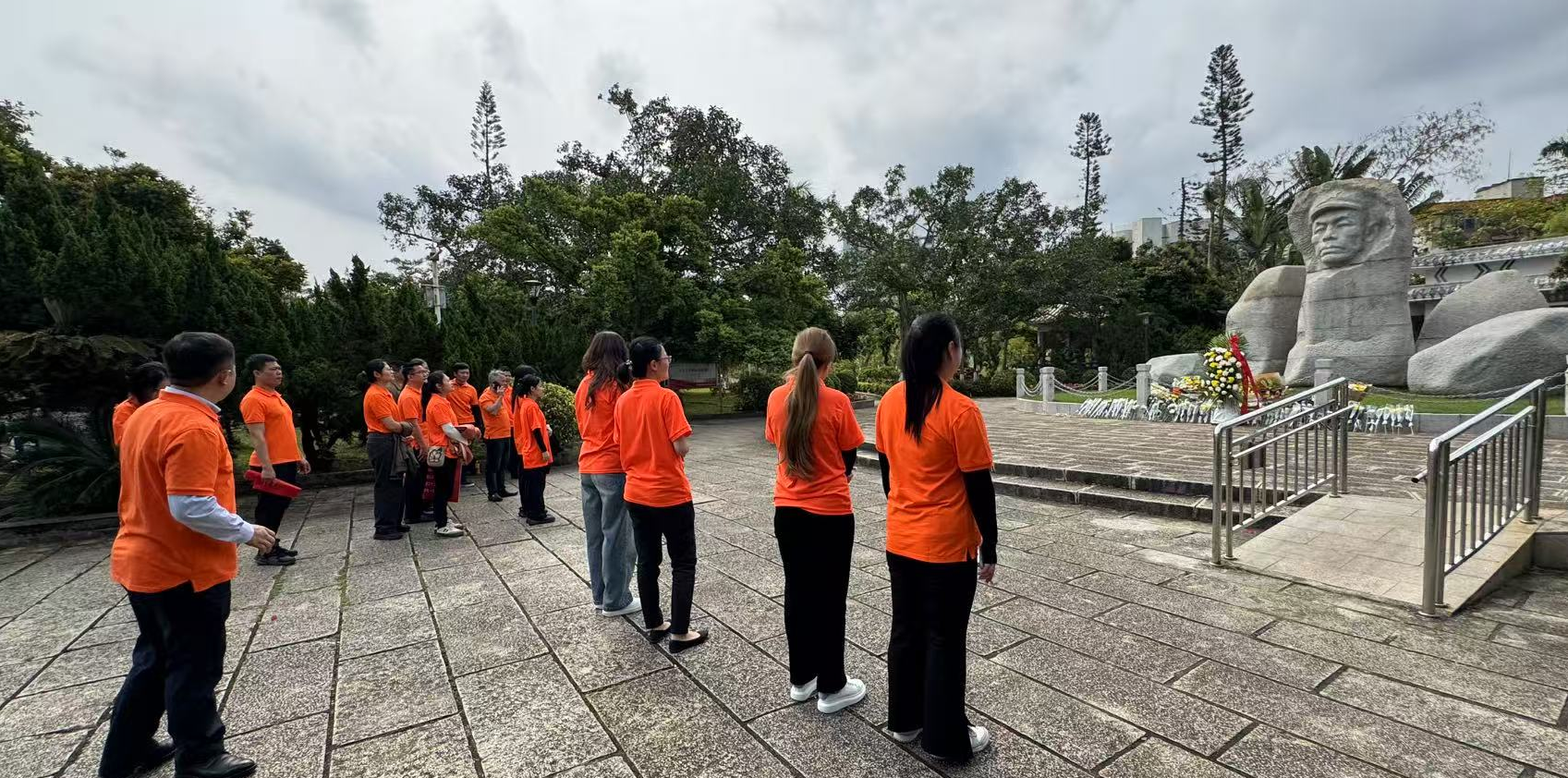 经过一段时间的等待才轮到我们。我们首先向烈士敬献花篮,花篮缎带上写着“为坚持琼崖革命23年红旗不倒牺牲的烈士们永垂不朽!”“为解放海南岛渡海牺牲的烈士们永垂不朽!”鲜艳的花篮寄托我们对革命先辈的崇敬和哀思。